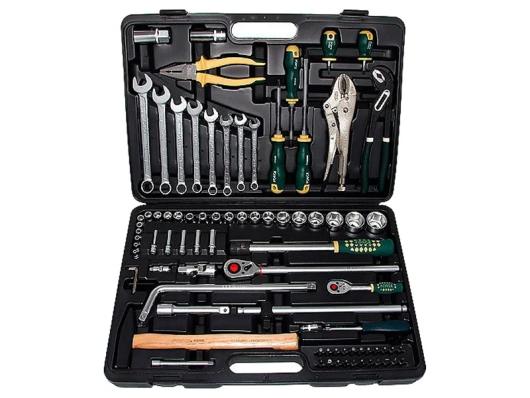 - Инструмент в комплекте трещотка, вороток для головок, рукоять для бит, отвертки, ключи гаечные, пассатижи, молоток, шестигранники